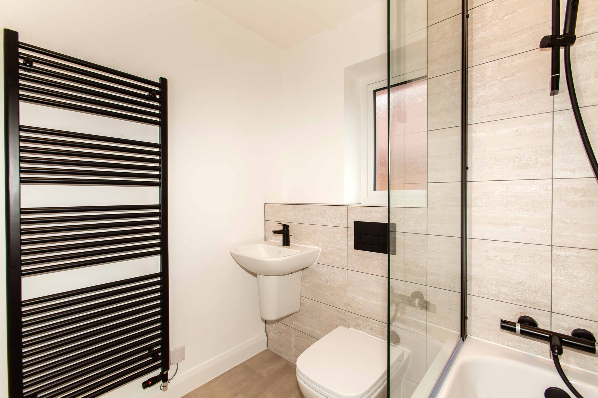 - Family Bathroom With White Vitra Sanitaryware, Hansgrohe Shower Over Bath and Porcelanosa Tiling